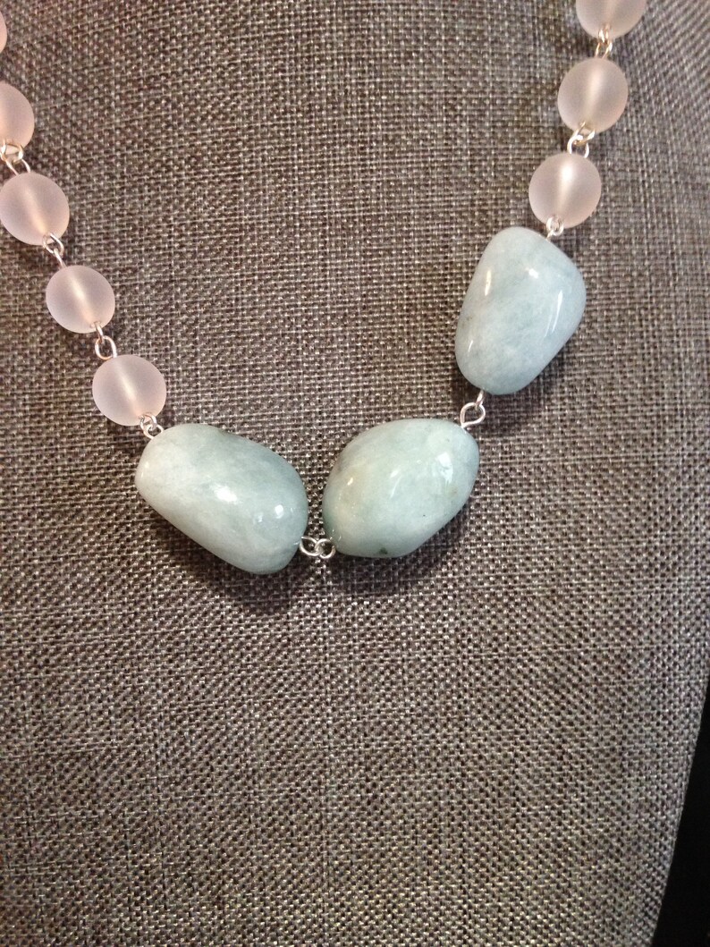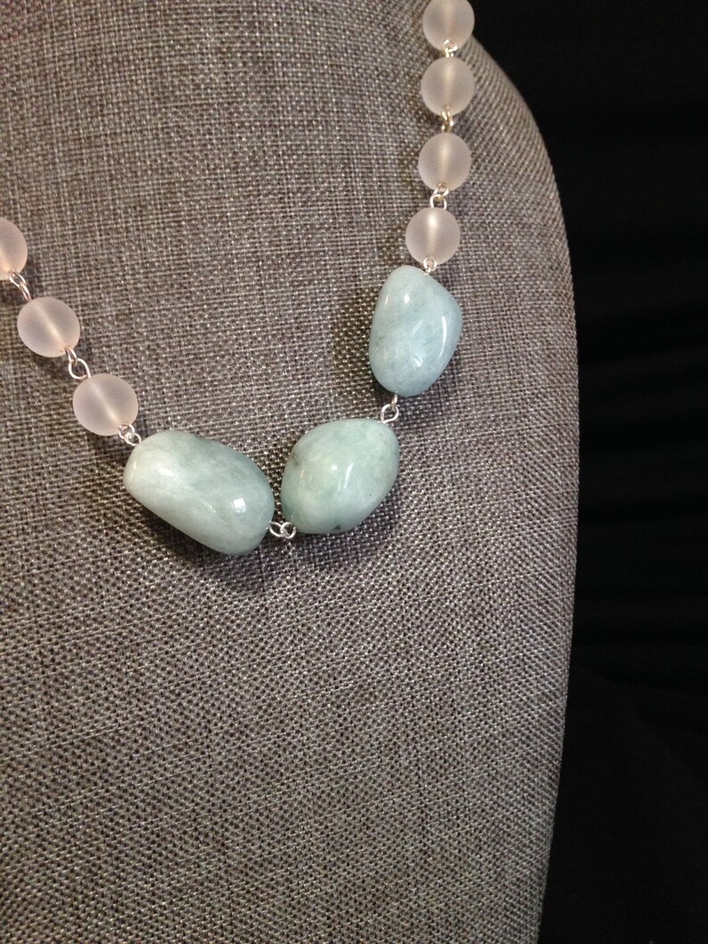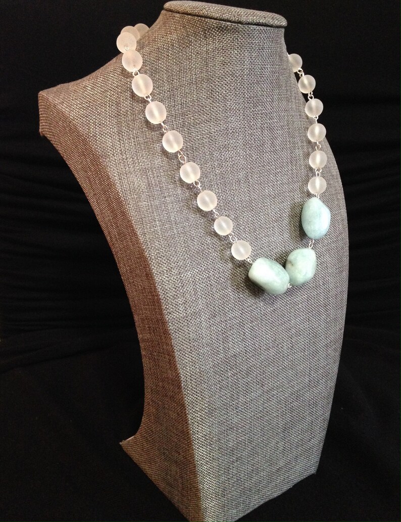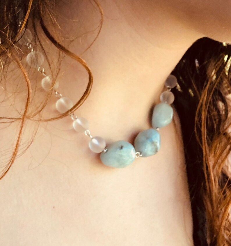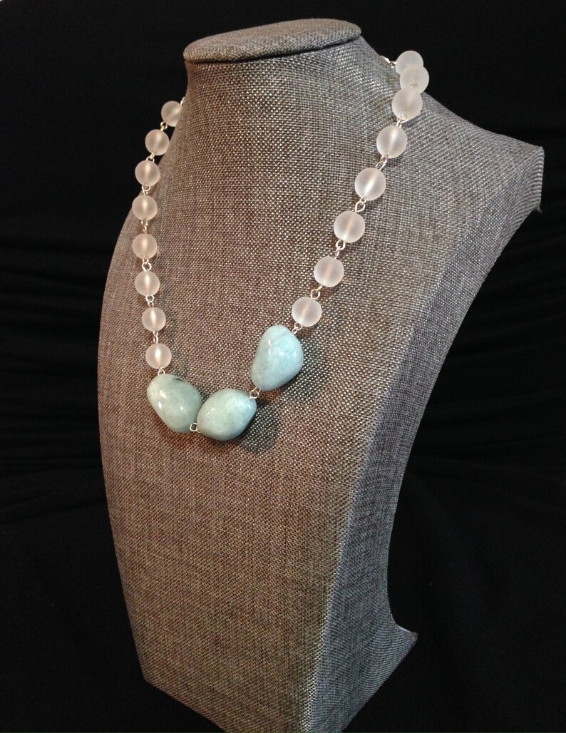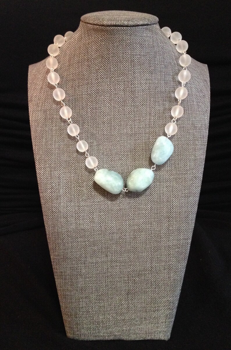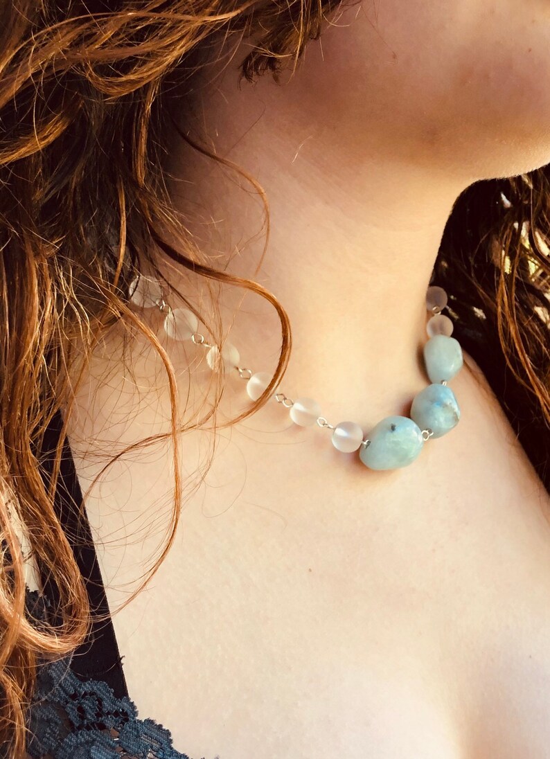 Genuine Aquamarine Blue and Quartz beaded statement necklace