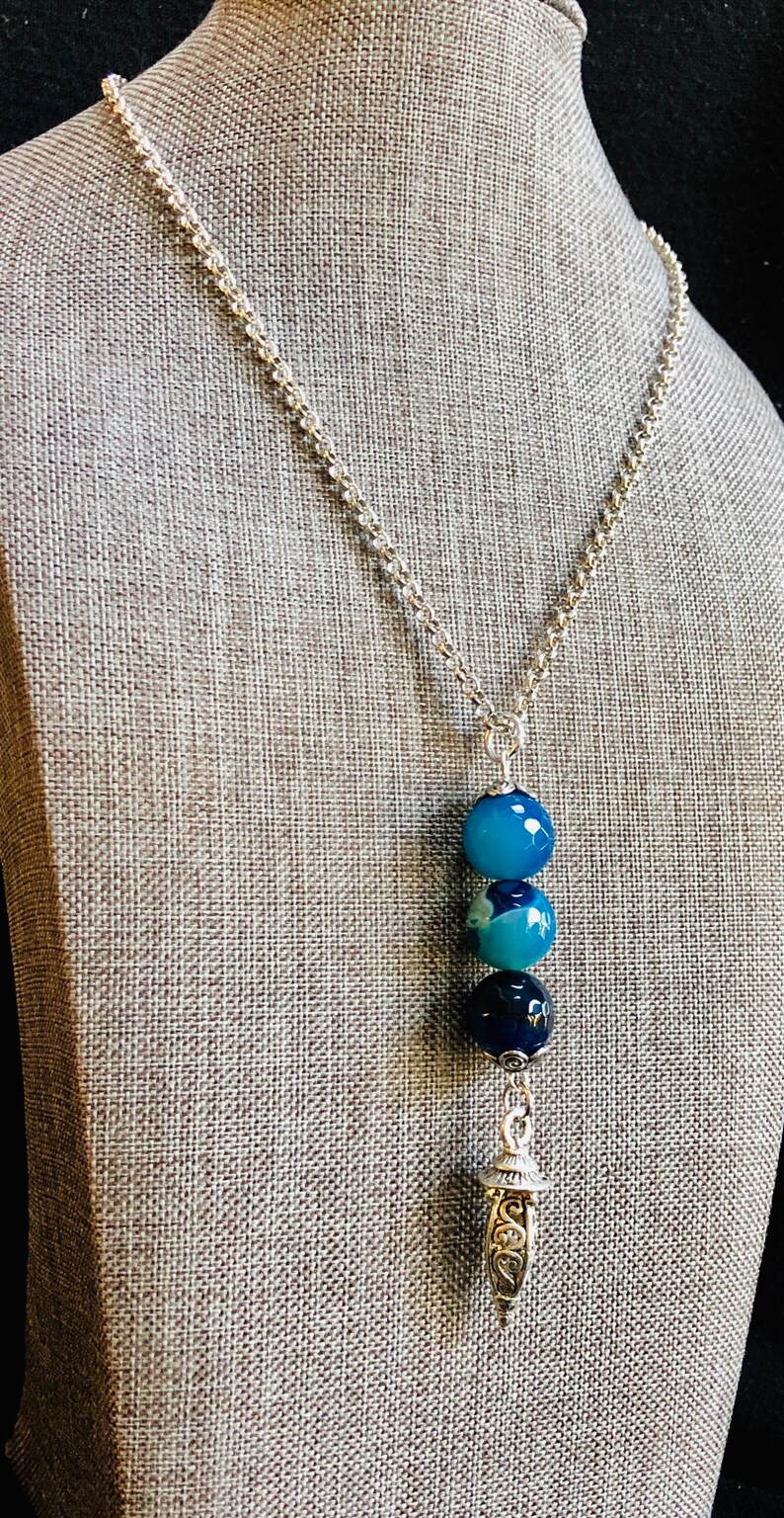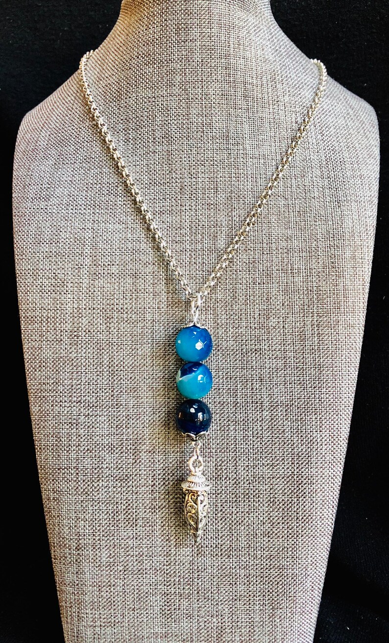 Blue agate is said to be a stone of encouragement and support, one that calms, uplifts and elevates. Coupled with this beautiful Tibetan charm it makes a lovely accessory!