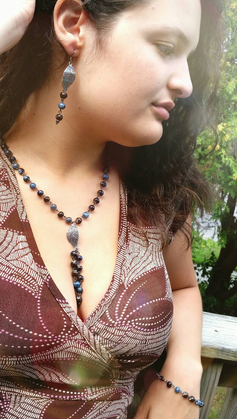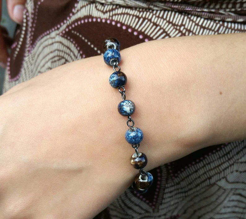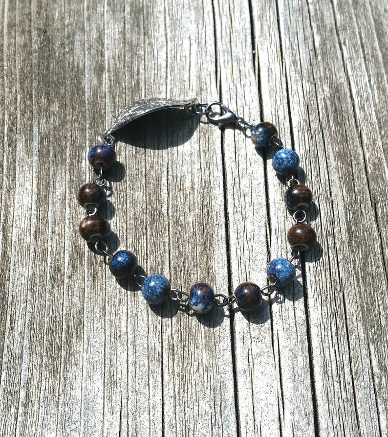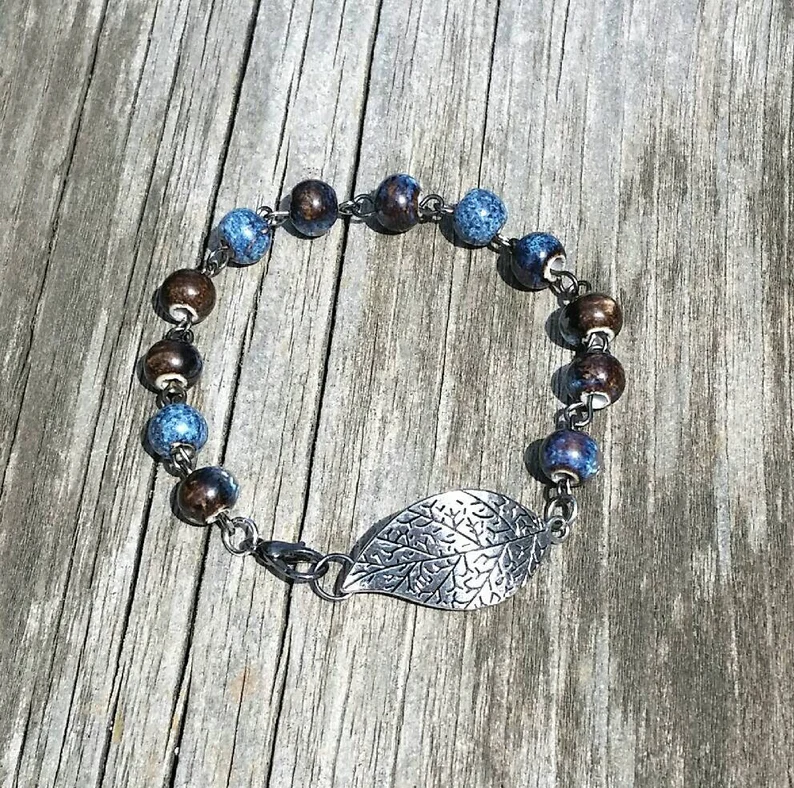 Each blue and brown ceramic bead used is totally unique. Each one is like a beautiful painting. I made the blue bracelet with a silver leaf clasp detailing and it is a stunning addition to any outfit, weather it is classy or more casual.