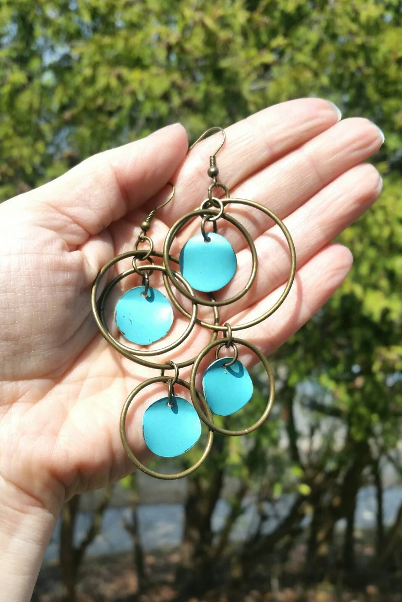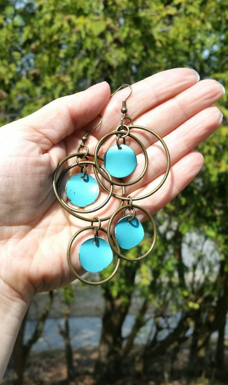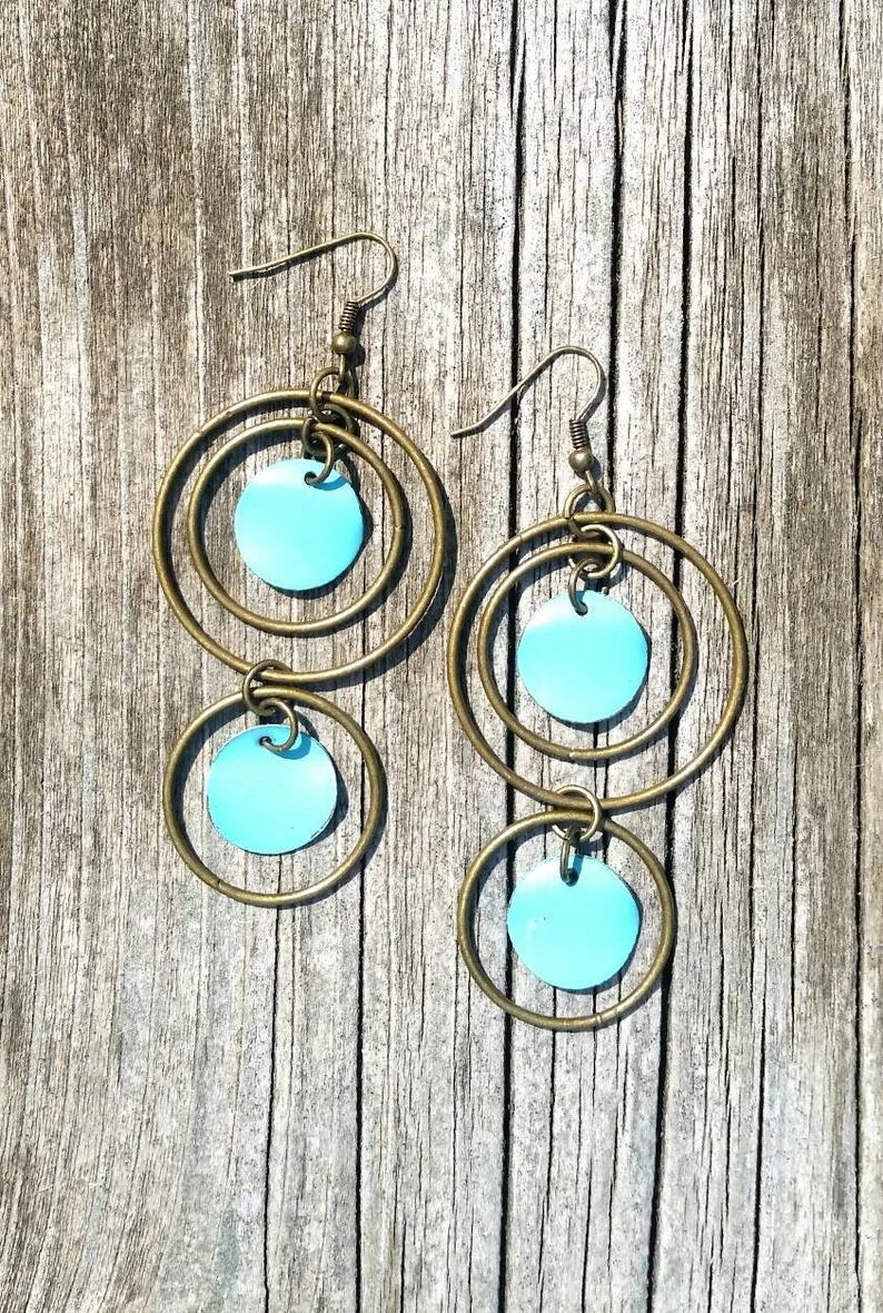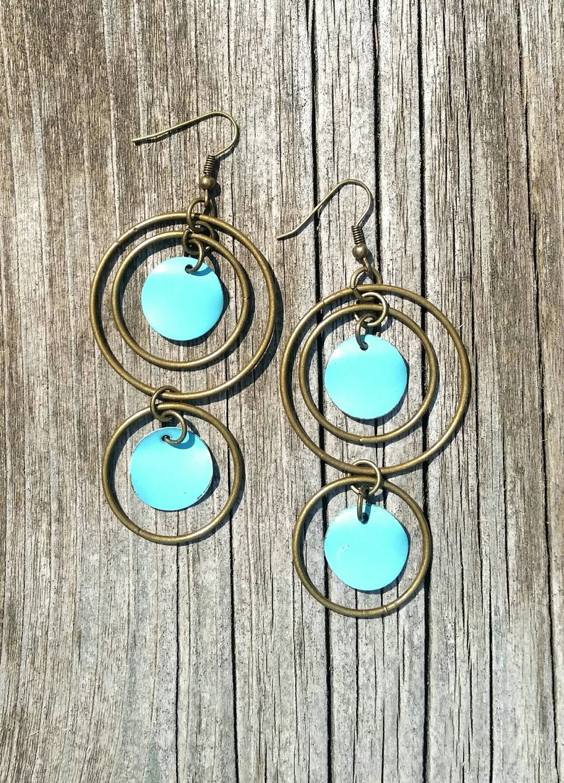 I combined beautiful blue and bronze together to make a long dangle earring that can add drama to any style! They hang 4 inches from the ear.