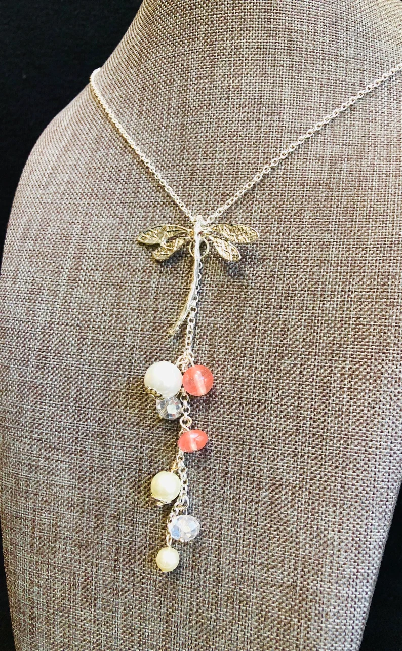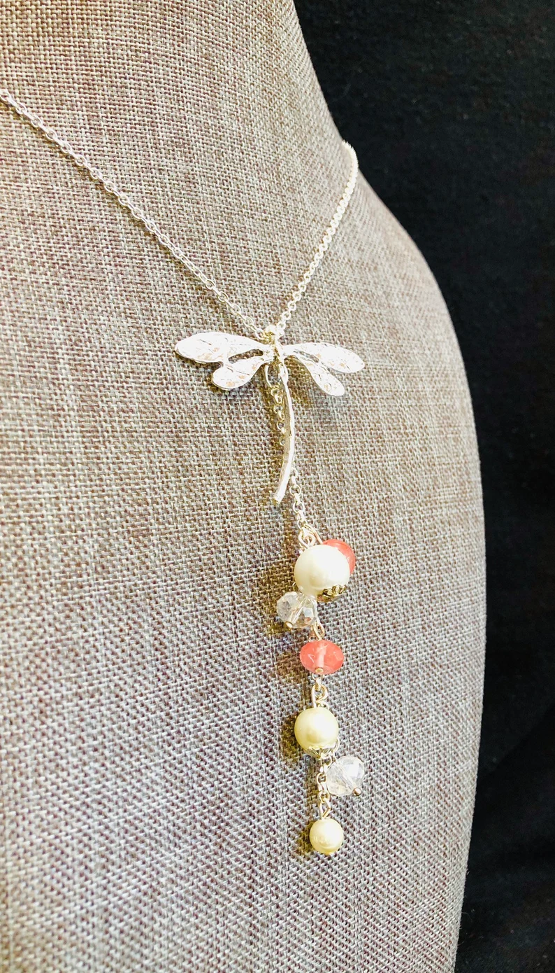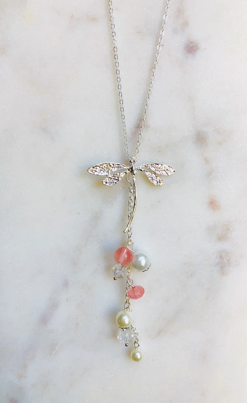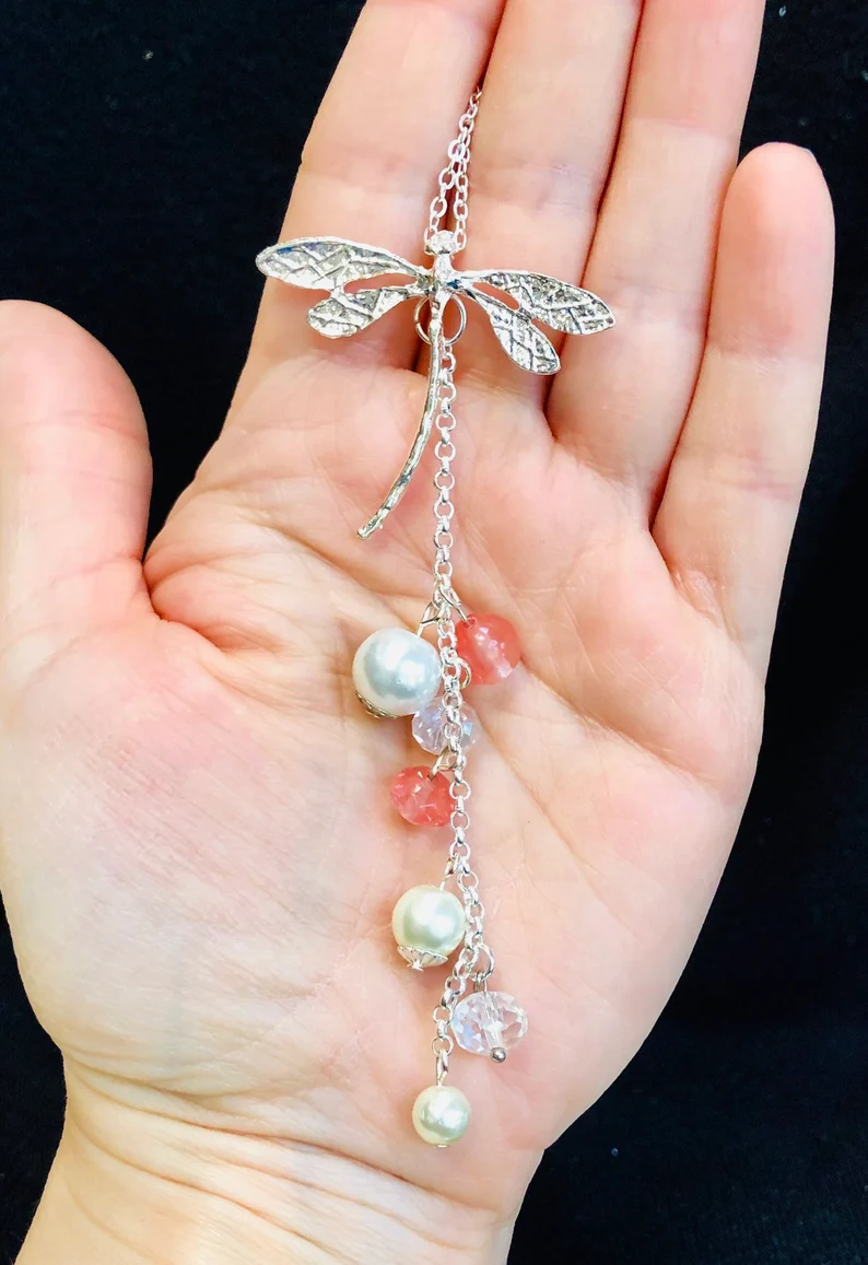 I added the pendant to a simple 18 inch silver chain. Some natural gemstones were added to bring this pretty necklace some colour. A few champagne pearls, crystal beads and genuine volcanic quartz beads created a beautiful cascading detail to the dragonfly pendant necklace.