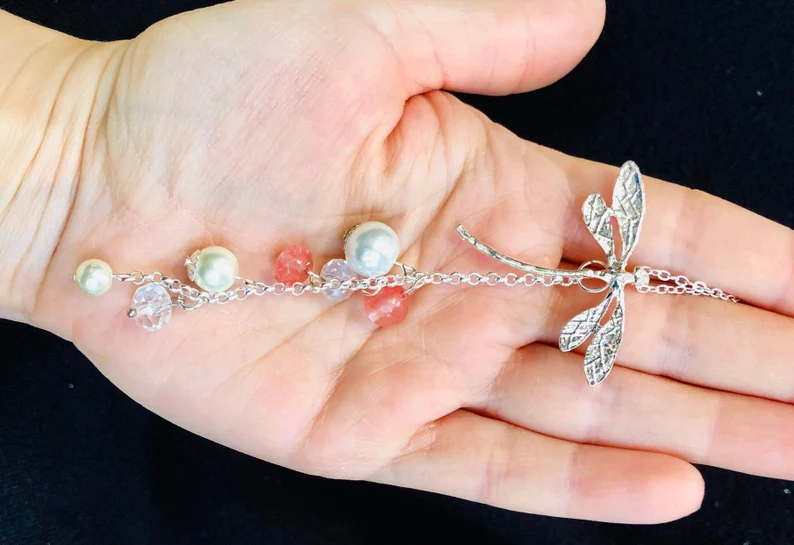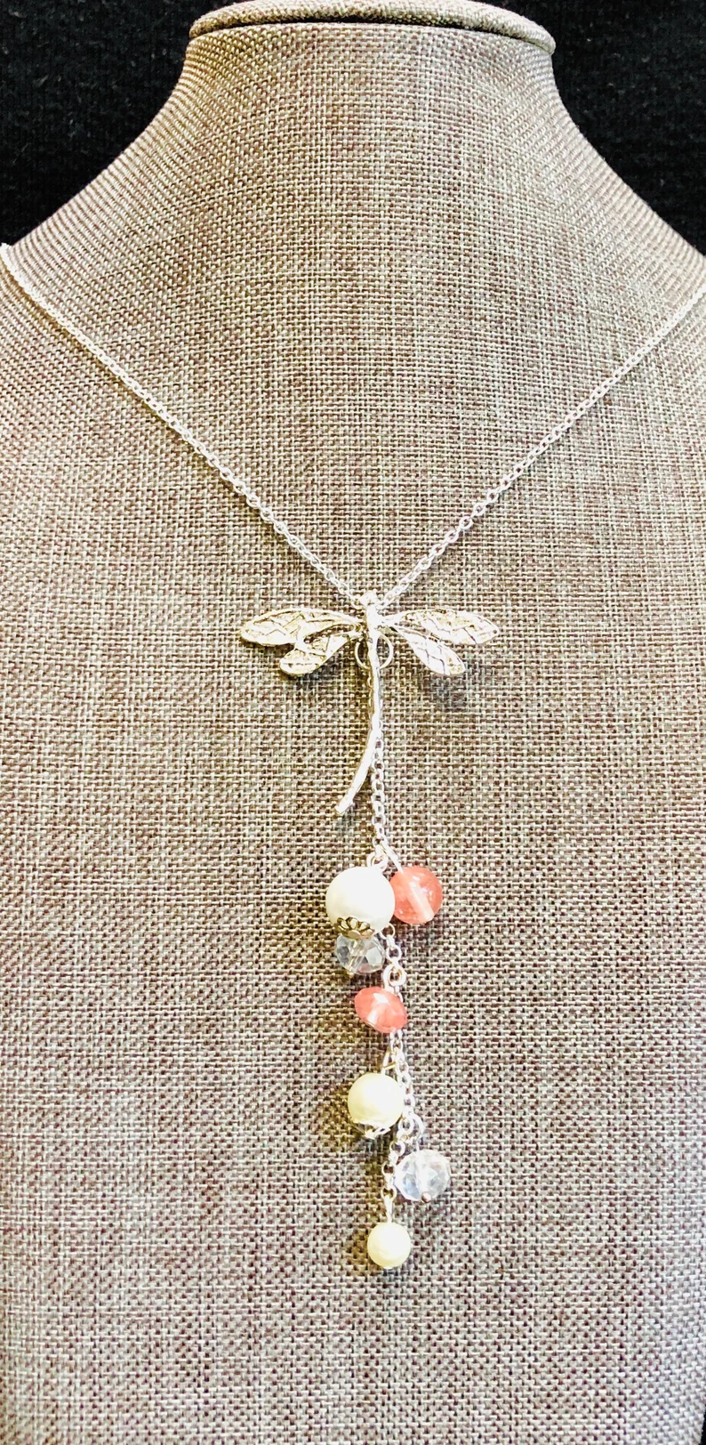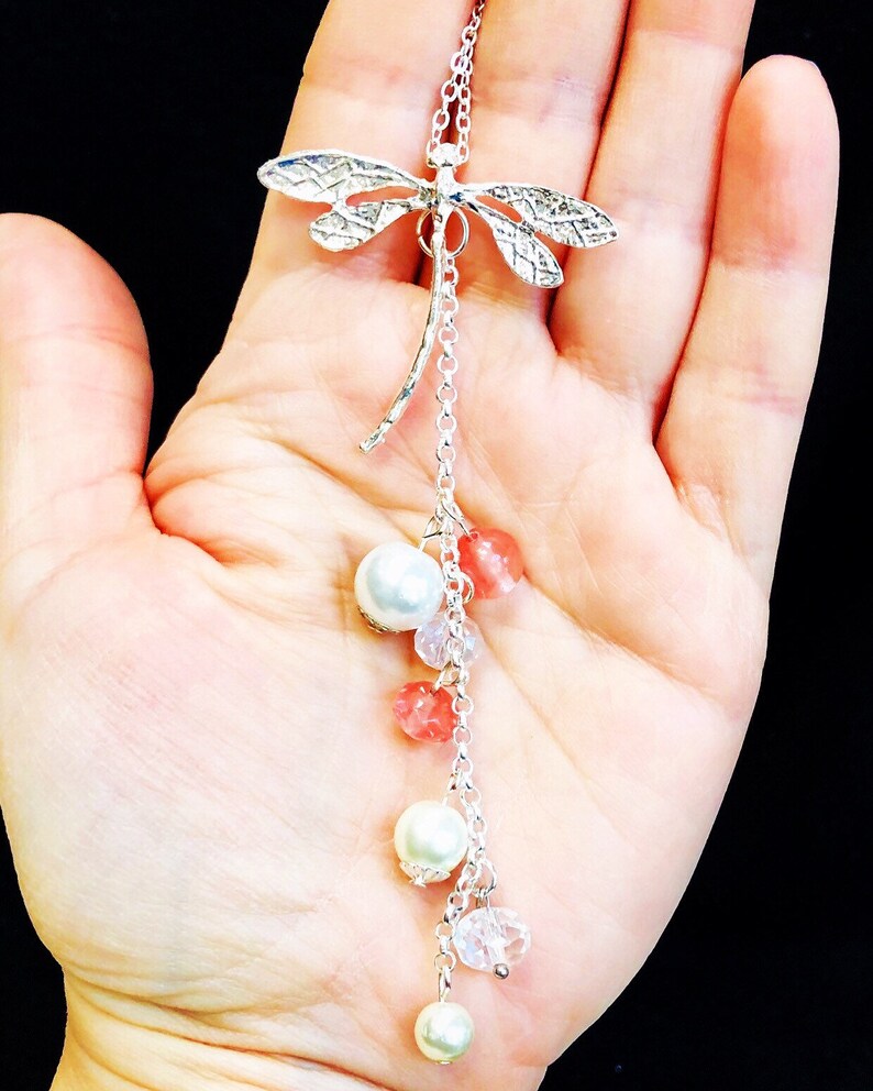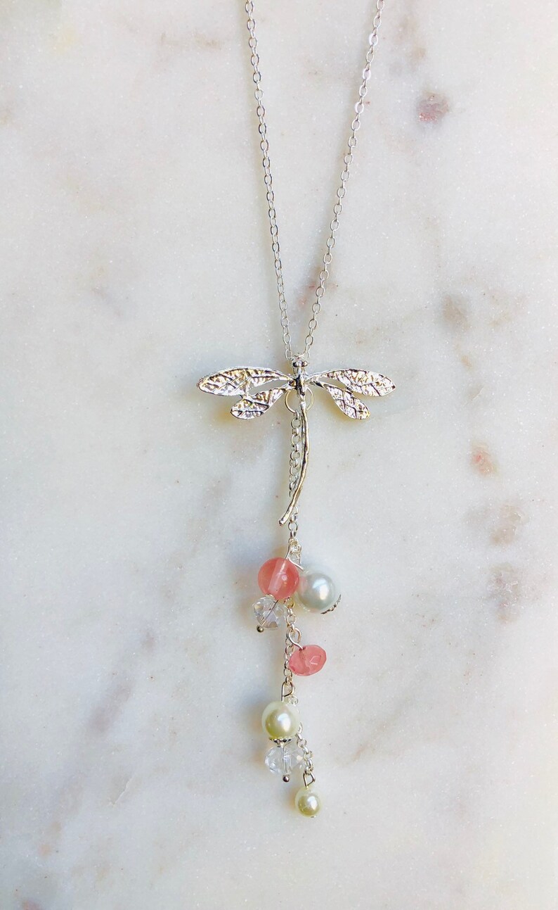 I added the pendant to a simple 18 inch silver chain. Some natural gemstones were added to bring this pretty necklace some colour. A few champagne pearls, crystal beads and genuine volcanic quartz beads created a beautiful cascading detail to the dragonfly pendant necklace.