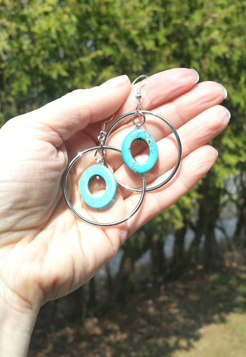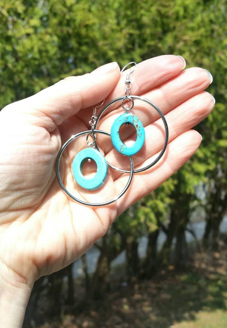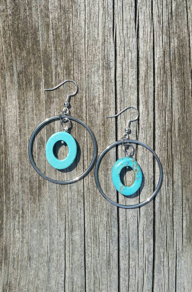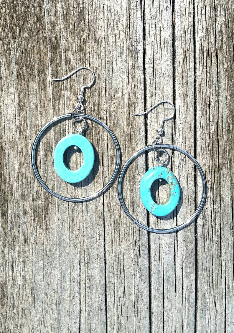 Simple, yet stylish turquoise and silver hoop dangle earrings. These earrings will go with anything! From fancy to casual they add sparkle to any outfit.