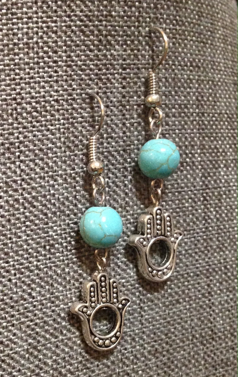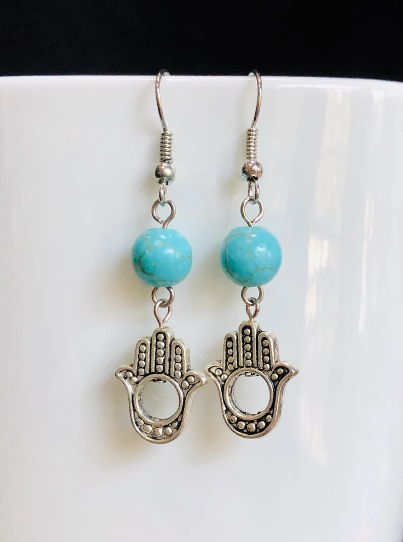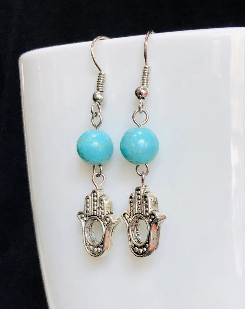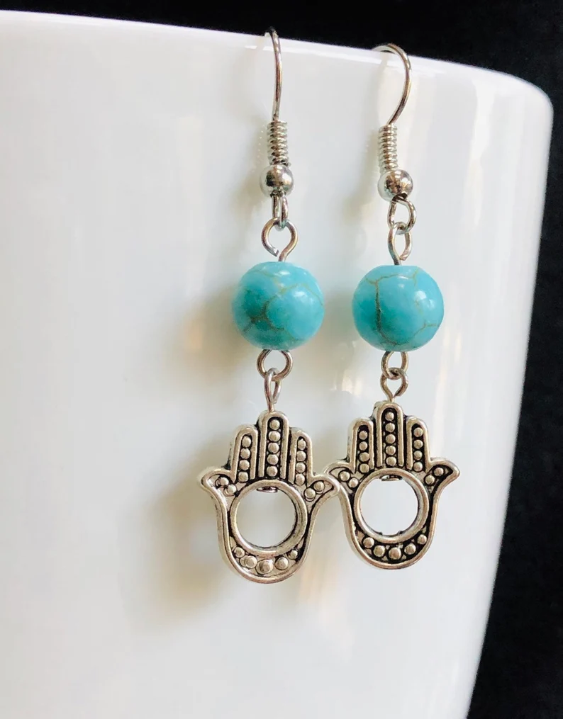 Turquoise and Hamsa Hand Dangle Earrings hang 2 inches from the ear. The beautiful turquoise blue compliments the silver details perfectly.