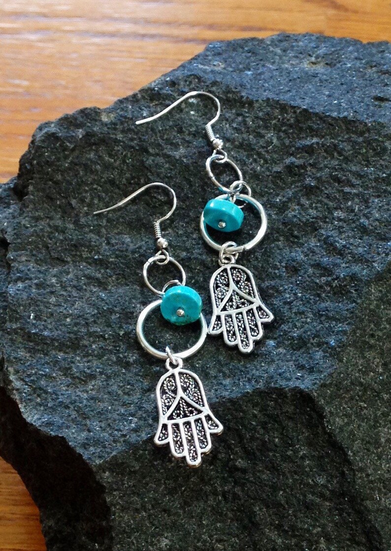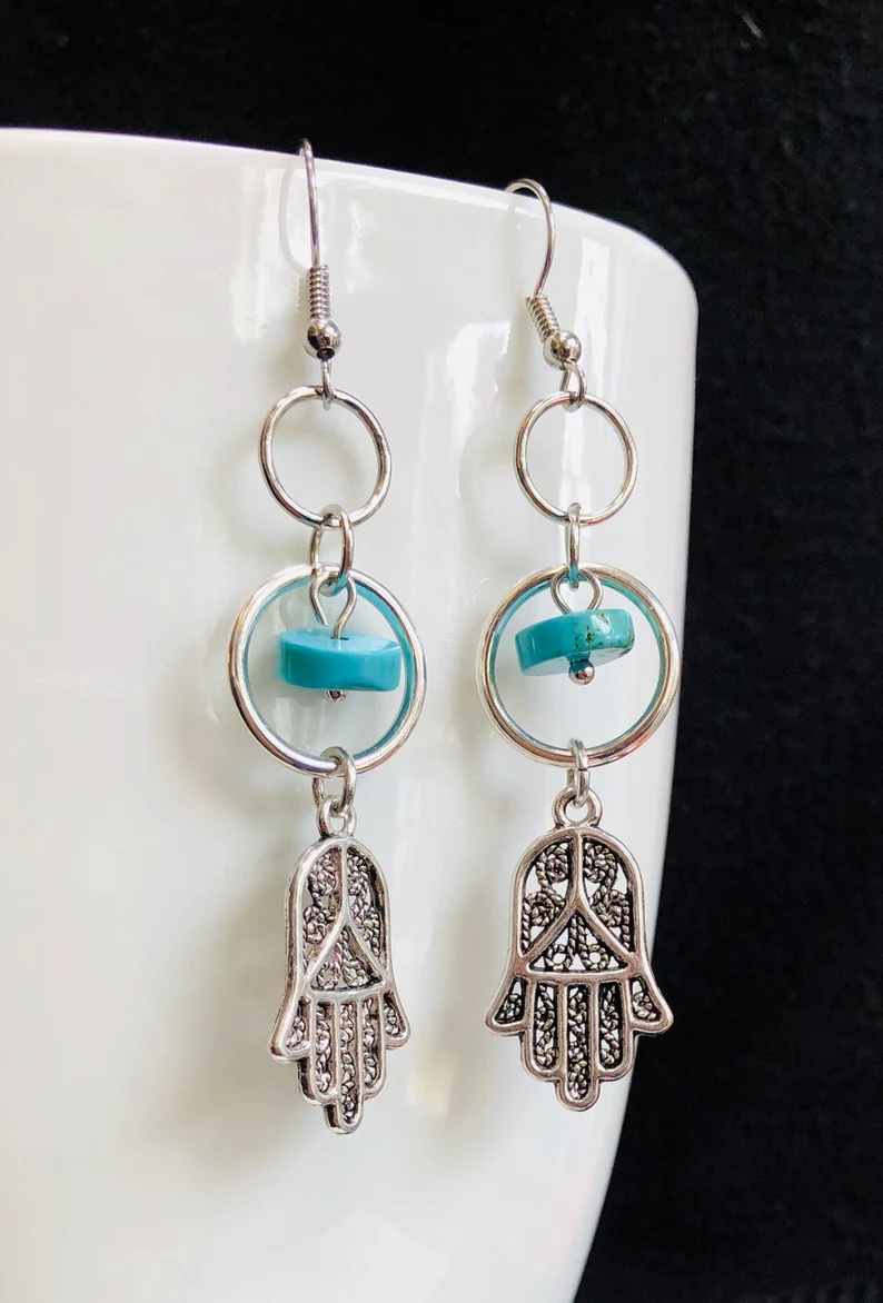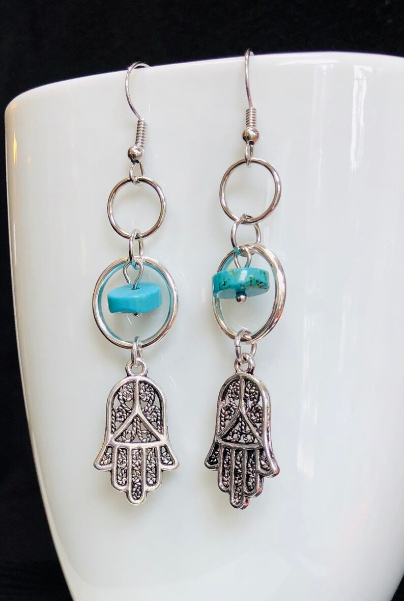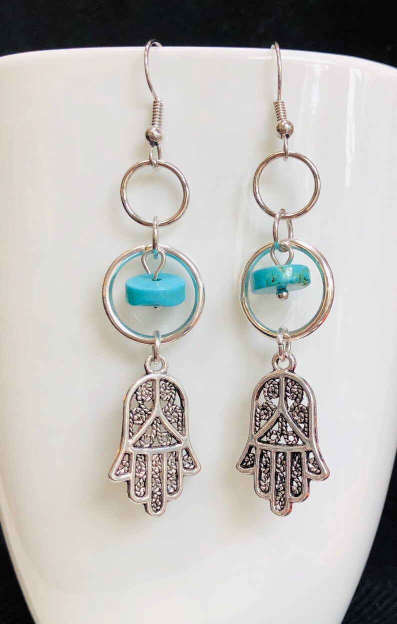 Turquoise and Hamsa Hand Dangle Earrings hang 2.5 inches from the ear. The beautiful turquoise blue compliments the silver details perfectly.